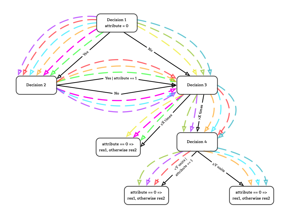 That’s not as simple anymore. Also note, that the attribute is sometimes updated, leading to different result types (res1 for attribute == 0, res2 for all other cases). It was tedious to create these images to help me see the paths — and fiddling the the arrow to make it look reasonably good, was extra work. To deal with more cases I wanted another approach.